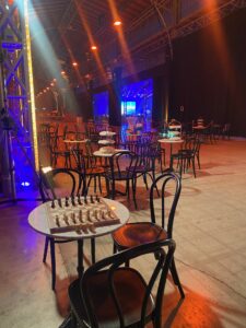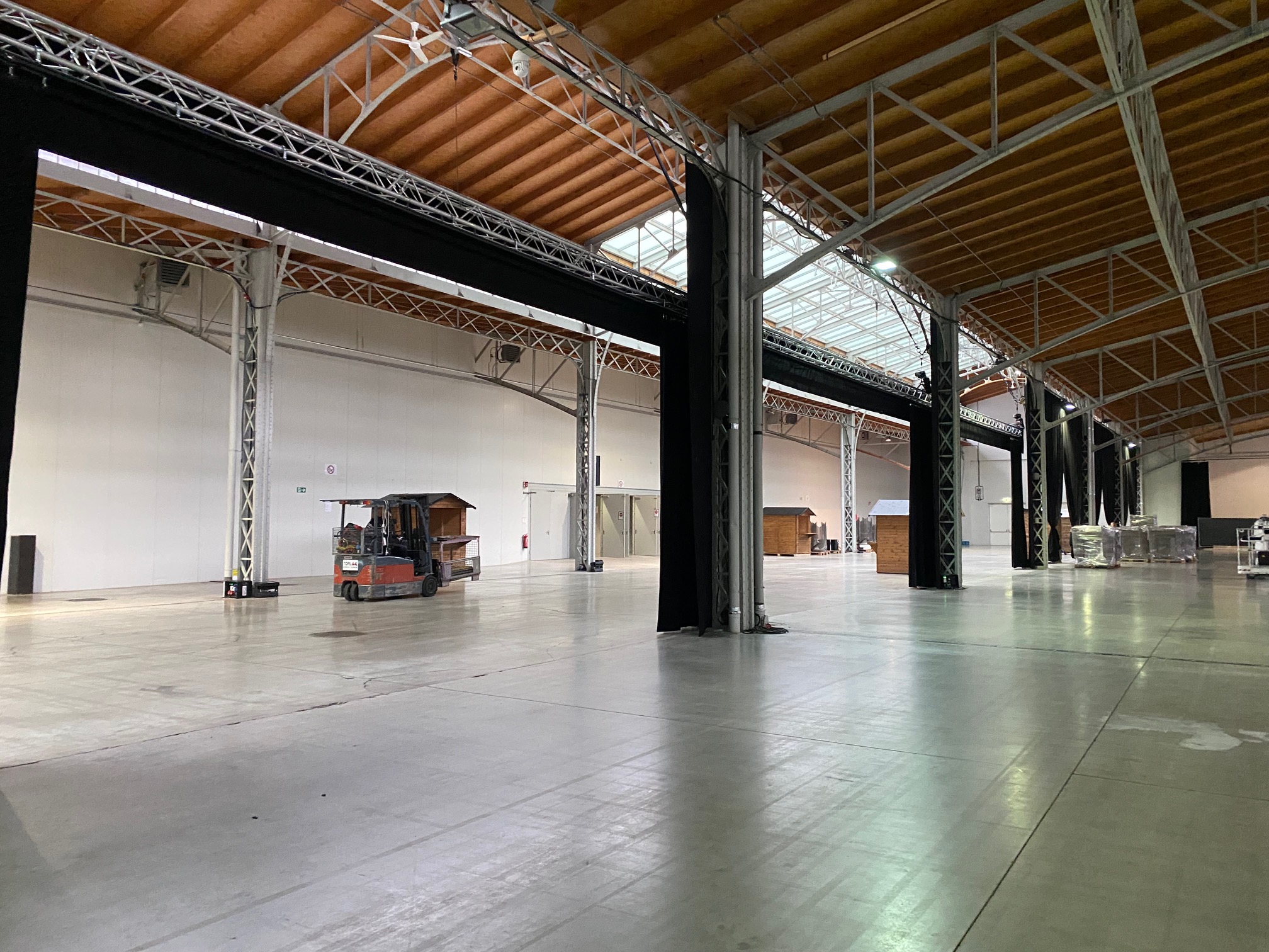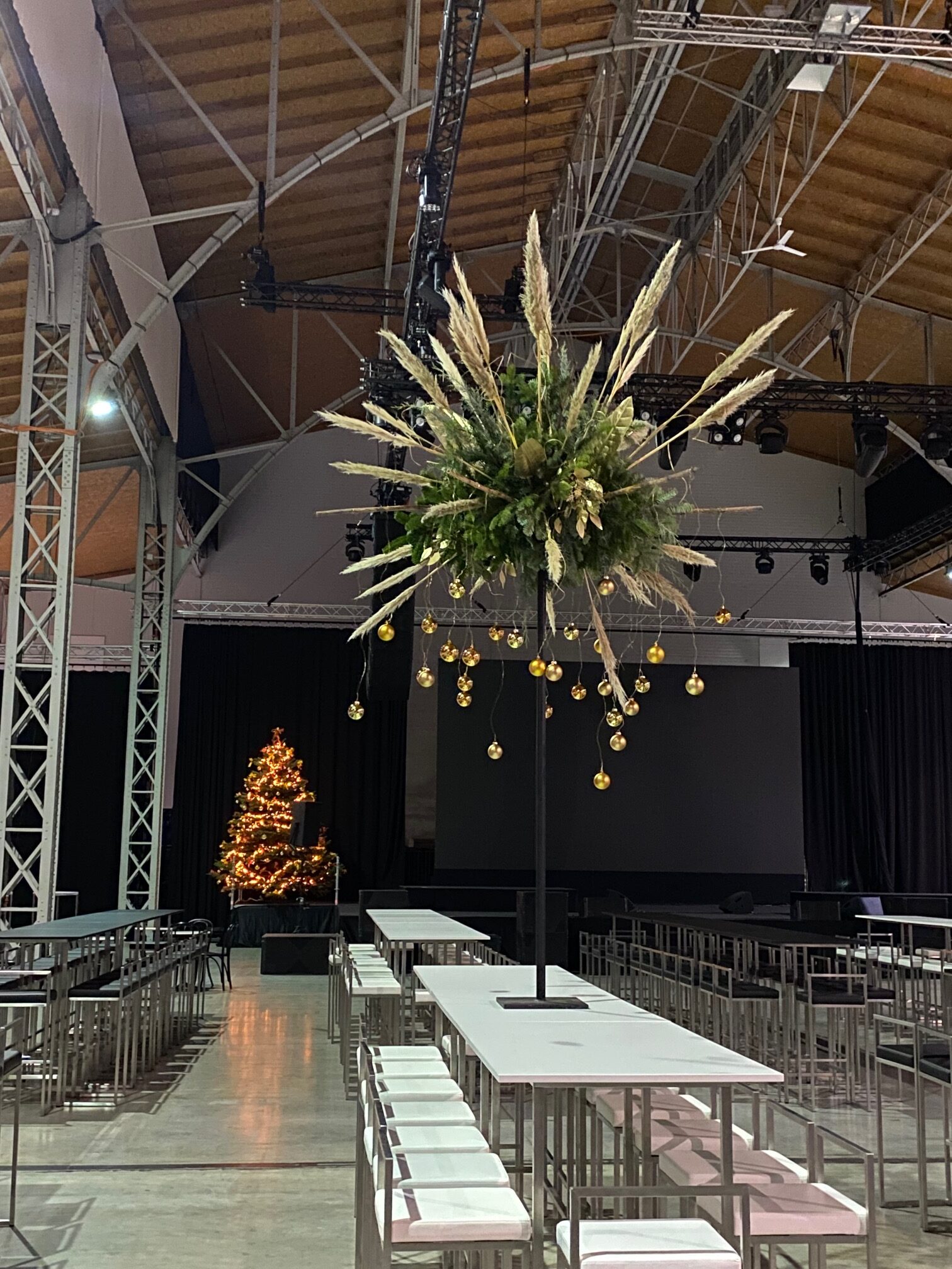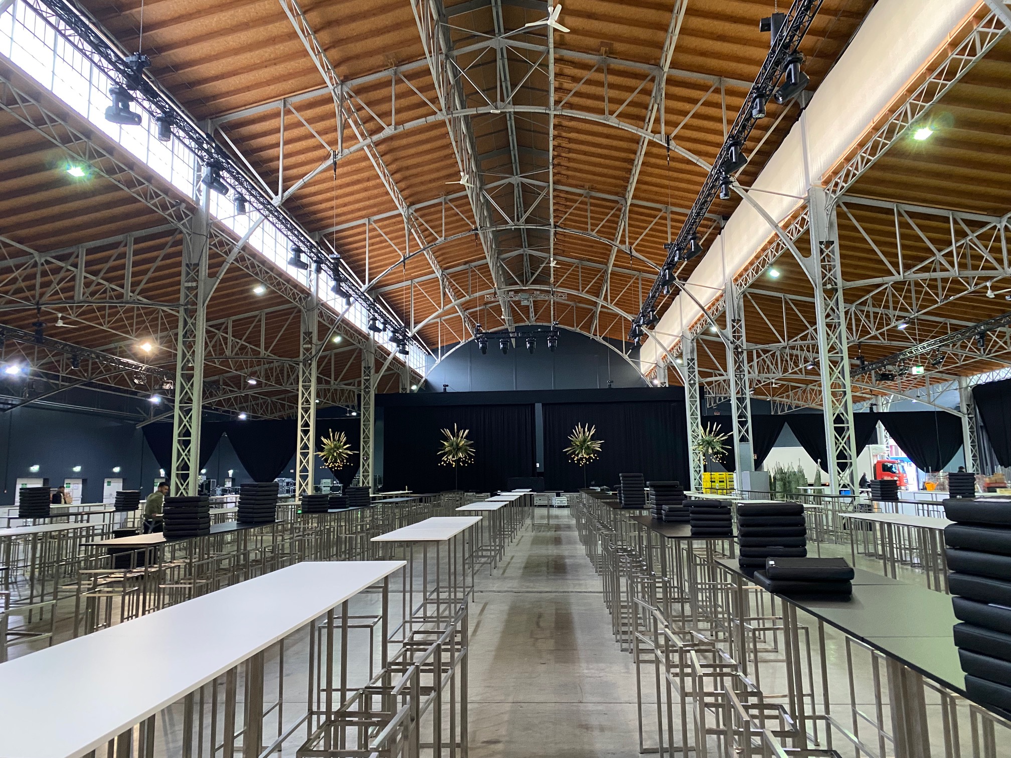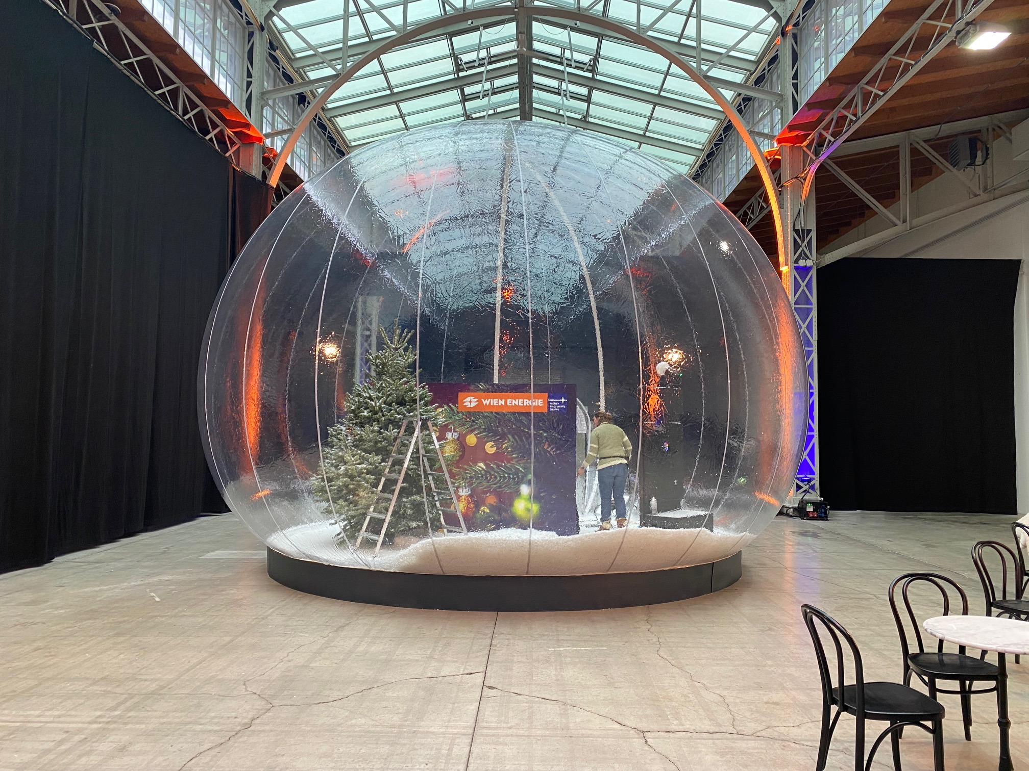 Am 4. Dezember ging es ab den frühen Morgenstunden rund in der Marx Halle, im Studio 3: Strom, Möbel, Dekoration und Catering wurde angeliefert und vom Zeitgeist-Team koordiniert, um ein besonderes Weihnachtsfest vorzubereiten. Die technische Ausstattung inklusive LED-Wall und Projektionswürfel wurde bereits Tage zuvor installiert. Viele helfenden Hände waren Vorort, um 6 Weihnachtshütten, rund 350 Hochtische, 38 Kaffeehaus-Tische, 50 Buffet-Tische, eine Cocktailbar (Durchmesser 7 Meter), 50 Garderobenständer und zig Bankett-Tische, einige Christbäume sowie Blumenständer, eine Foto-Schneekugel, eine Fotobox sowie einen Video-Spin aufzustellen. Und was notwendig war, wurde an den den Strom gehängt. 10.000 Teller, 18.000 Stück Besteck, 25.000 Gläser, 120 Laufmeter Tischwäsche, 550 kg Eis wurde vom Catering angeliefert. Am 5. Dezember am frühen Nachmittag stand alles soweit, dass die Soundchecks mit den Live-Acts über die Bühne gehen konnten. Die Gäste können eintreffen und das Fest kann beginnen!